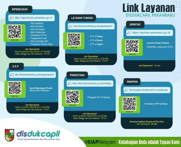 Masyarakat bisa mengakses Link Layanan Online Disdukcapil Kota Pekanbaru, yaitu Sipenduduk dengan alamat website https://sipenduduk.pekanbaru.go.id. Jam operasional layanan ini pada hari Senin sampai Jumat, Pukul 08.00 sampai dengan 17.00 WIB.