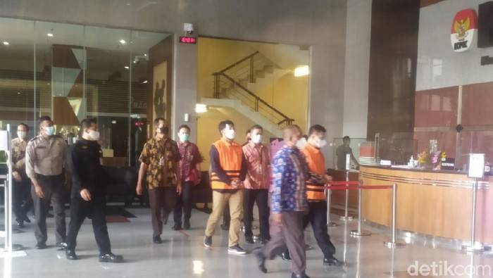 Pantauan detikcom, Jumat (9/4/2021), pukul 16.40 WIB, Aa Umbara dan Andri berjalan dikawal penyidik di lobi Gedung Merah Putih KPK. Keduanya mengenakan rompi tahanan KPK.