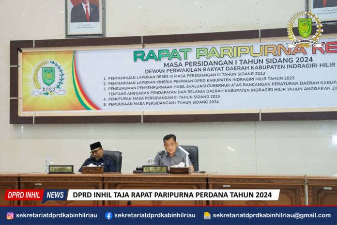 Tembilahan (RJ) - Bertempat di gedung utama Dewan Perwakilan Rakyat Daerah (DPRD) Kabupaten Indragiri Hilir (Inhil) Jalan Soebrantas Tembilahan, DPRD taja Rapat Paripurna Perdana Tahun 2024, Kamis (4/1/2024).