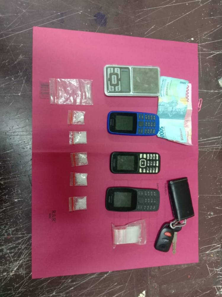 Barang bukti yang dapat diamankan dan dilakukan penyitaan dari pelaku, 6 ( enam ) paket plastik yg berisi sabu, timbangan digital, uang Rp. 150.000, 3 ( tiga ) unit handphone, 1 ( satu ) unit mobil merk Agya BG 1310 IB,