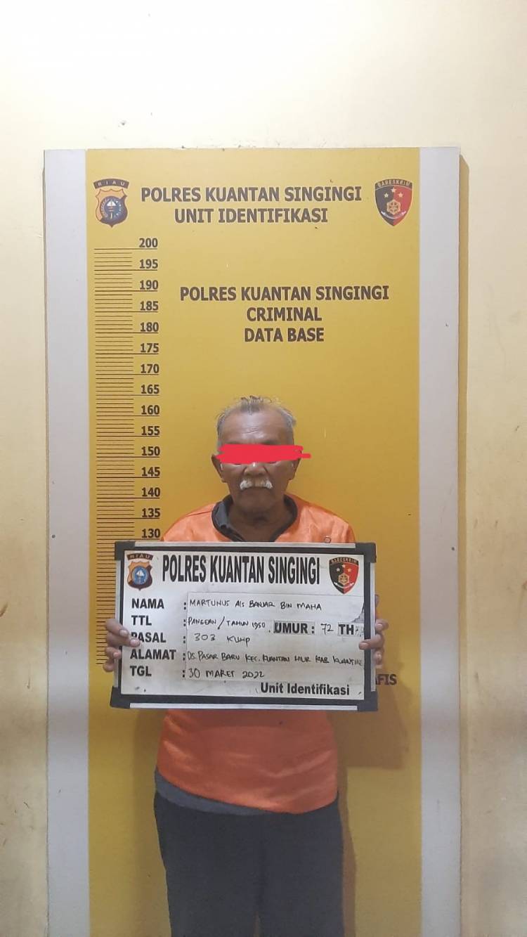 RIAUJURNAL.COM, Teluk Kuantan - Sat reskrim Polres Kuansing meringkus seorang kakek berumur 72 tahun berinisial MTS diduga sebagai bandar judi toto gelap (togel) di sebuah warung kopi, di Kelurahan Pasar Usang Baserah Kecamatan Kuantan Hilir Kabupaten Kuantan Singingi (Kuansing) Rabu (30/03/2022) siang.
