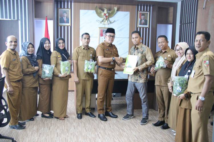 Kepala DKP Pekanbaru Maisisco, Sekdis Adi Lesmana, Kabid Keamanan dan Konsumsi Pangan Yarnengsih Alam dan pemilik DK Green Farm Donny Zarhendra foto memperkenalkan beberapa komoditas sayuran segar yg telah teregistrasi