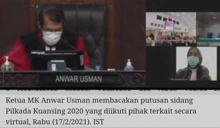 Putusan itu dibacakan Ketua MK Anwar Usman bersama Hakim MK lainnya pada sidang secara virtual, Rabu (17/2/2021). Dengan demikian, MK telah memperkuat atau mempertegas kemenangan pasangan calon nomor urut 1, Andi Putra SH MH dan H Suhardiman Amby MM sebagai peraih suara terbanyak Pilkada Kuansing 2020 lalu.