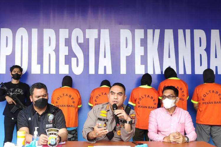 Turut mendampingi Kasat Reskrim Polresta Pekanbaru, Kompol Juper Lumbantoruan, di belakangnya dijejerkan kelima pelaku.