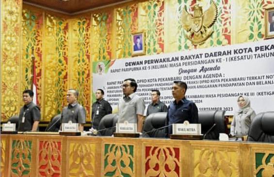 RIAUJURNAL.COM, Pekanbaru -DPRD Pekanbaru melaksanakan Rapat Paripurna Jawaban Pemerintah terhadap Pandangan Umum Fraksi terkait Nota Keuangan dan Ranperda APBD Perubahan Tahun Anggaran 2023, Senin (25/9/2023).