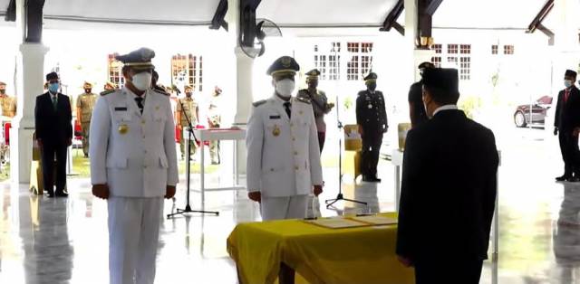 Andi Putra SH MH dan Suhardiman Amby MM saat pengucapan Sumpah Jabatan sebagai Bupati Kuansing Periode 2021-2026