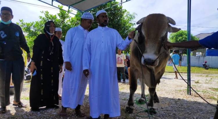 RIAUJURNAL.COM, Pekanbaru - Anggota DPRD kota Pekanbaru H Fathullah SH MH menyembelih hewan kurban mereka sekeluarga seberat 1,373 ton sapi jenis Brangus blester pada momen Idul Adha 1441 hijriah/2021.