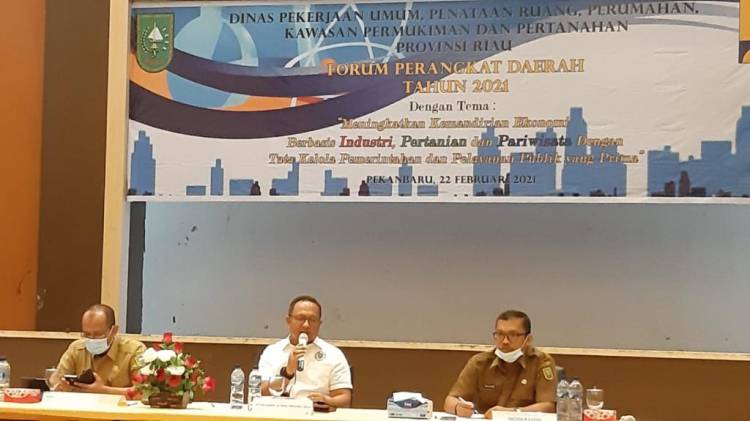 Kepala Bappedalitbang Provinsi Riau Emri Juli Harnis, dalam pemaparannya menyampaikan materi Prioritas dan Arah Kebijakan Pembangunan Daerah Provinsi Riau di Bidang Infrastruktur ke-PU-an, Penataan Ruang, Perumahan, Kawasan Permukiman dan Pertanahan Provinsi Riau Tahun 2022.