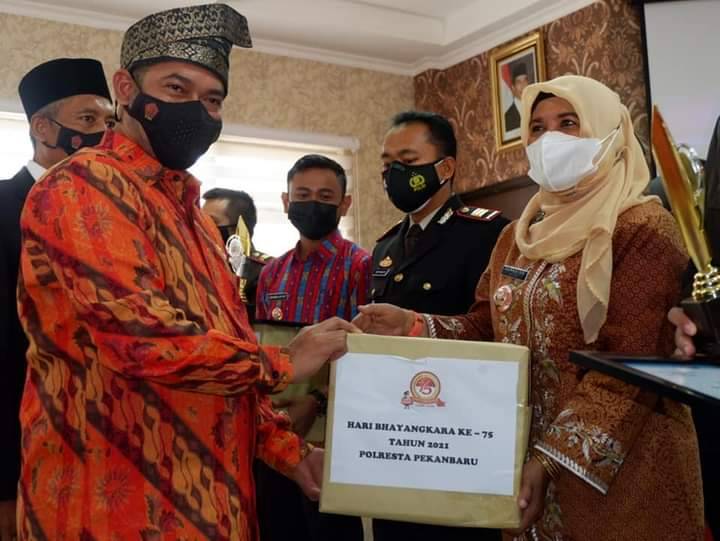 RIAUJURNAL.COM, Pekanbaru - Memperingati Hari Ulang Tahun (HUT) Bhayangkara ke-75 yang mengusung tema 'Transformasi Polri Yang Presisi Mendukung Percepatan Penanganan Covid-19 untuk Masyarakat Sehat dan Pemulihan Ekonomi Nasional Menuju Indonesia Maju'.